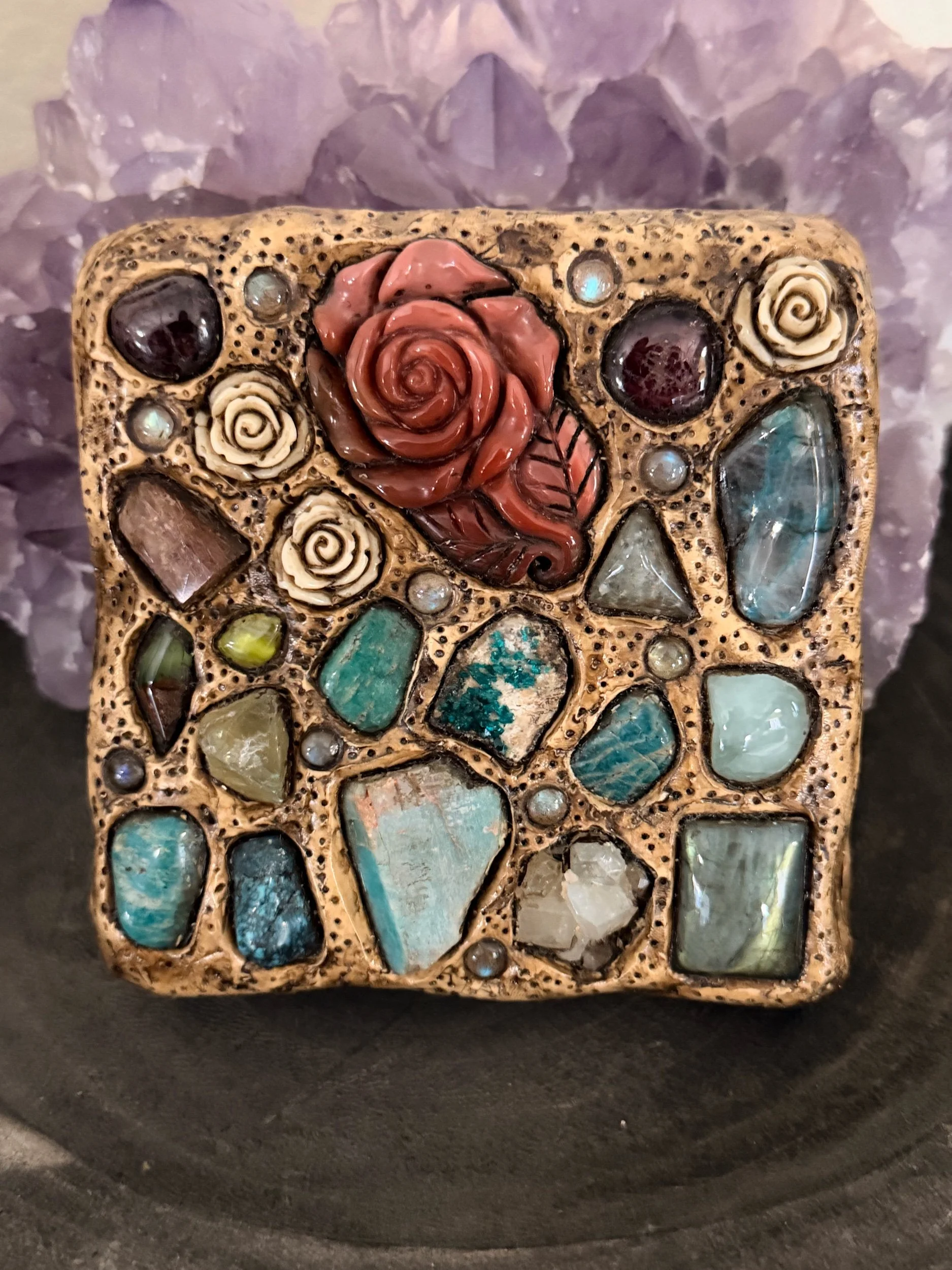 4x4” Jenvy Fox original polymer clay and gemstone art piece featuring carved roses, dioptase, labradorite, amazonite, included quartz, ruby, turquoise, peridot, and more. I do not work with polymer clay anymore, so this one of a kind artwork is truly a limited edition.