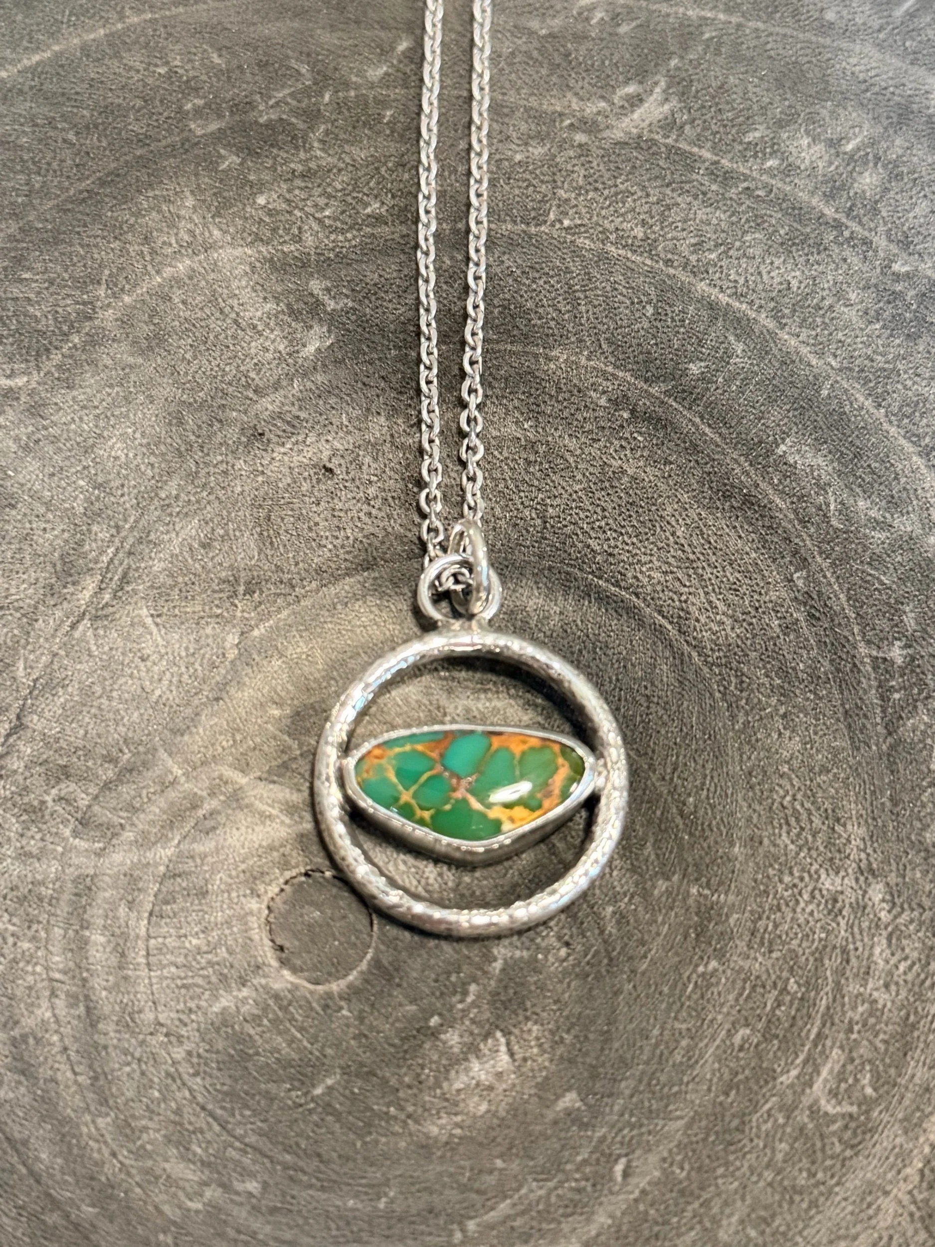 Image 1 of 3 Image 2 of 3 Image 3 of 3 Royston turquoise circle pendant $265.00 Sterling silver hand etched finish Royston turquoise pendant on a 16” sterling silver chain. Add To Cart Added! Sterling silver hand etched finish Royston turquoise pendant on a 16” sterling silver chain.